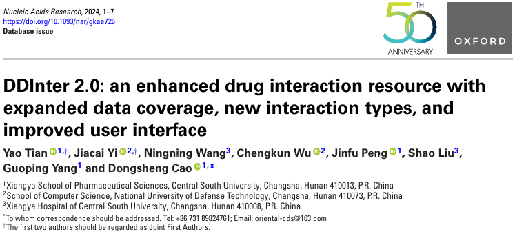 近日,伟德中国官网入口曹东升教授团队在国际权威期刊《Nucleic Acids Research》(IF=16.6)发表了题为“DDInter 2.0: an enhanced drug interaction resource with expanded data…