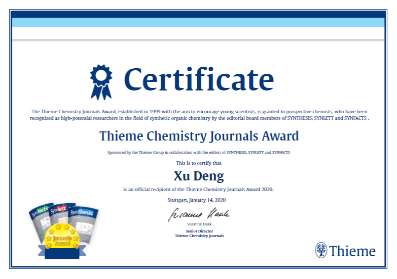 近日,公司伟德中国官网入口邓旭副教授荣获2020年度“Thieme Chemistry Journal Award”国际学术奖。该奖项是由德国Thieme Group(德国蒂莫出版集团)于1999年首次设立,每年颁发一次,由德…