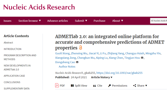 近日,公司曹东升教授团队与浙江大学侯廷军教授团队合作,在国际权威期刊Nucleic Acids Research(IF=11.504)上发表题为“ADMETlab 2.0: an integrated online platform for accurat…