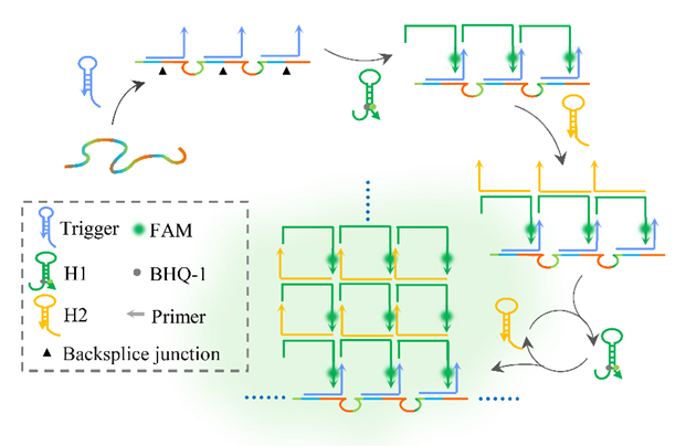 CircRNA作为一类新兴的生物标志物,在许多疾病的发生发展中扮演着重要的角色。然而,近年来检测方法的局限性却严重限制了circRNA的相关研究。因此,我们开发了一种基于网状杂交链式反应(netlike HCR)的高效便捷的circRNA检测方法。该方法结合了滚环扩增逆转录(RT-RCA)技术与巧妙设计的netlike HCR,实现了circRNA信号的双重选择与双重放大。不仅可消除线性异构体的干扰,对首尾相连的线性异构体也能够“免疫”。研究表明,该方法具有良好的灵敏度与选择性,能够在没有RNase R富集的情况下检测细胞、组织等生物样本中特定的circRNA。为低丰度的circRNA检测提供了一个简便而实用的平台。