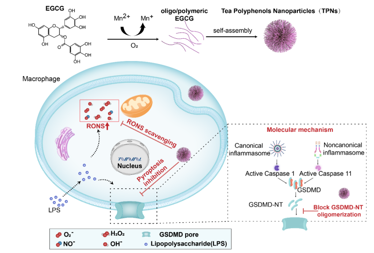 近日,伟德中国官网入口周文虎教授与湘雅三医院吕奔-赵锴教授团队合作,在纳米材料学领域权威期刊《ACS Nano》(IF=15.881, NI指数期刊)上发表了题为“Intrinsic Radical Species Scavenging Activities of Tea Polyphenols Nanoparticles Blocks Pyroptosis in Endotoxin-Induced Sepsis”的最新原创性研究成果。该研究利用金属离子催化下的表没食子儿茶素没食子酸酯(Epigallocatechin gallate, EGCG)氧化自聚,构建一种新型多功能纳米材料。该纳米材料可通过清除活性氮氧自由基和抗细胞焦亡两条途径,实现对脓毒症的治疗。