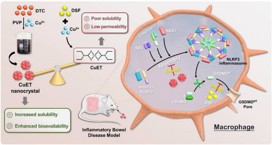 众所周知,药物开发是一个耗时昂贵的过程。相比于从头合成研发新药,老药新用更为简单快捷,可极大程度降低研发周期和成本。双硫仑(DSF)是一种口服乙醛脱氢酶(ALDH)抑制剂,已被美国食品药品监督管理局批准用于治疗酒精中毒,并且具有很好的抗癌活性。最近研究揭示DSF通过抑制焦亡执行蛋白GSDMD寡聚化展现出强大的抗细胞焦亡能力,并且Cu2+可显著增强其抗焦亡能力,但对于Cu2+如何增强DSF抗焦亡活性还无人阐明。本研究团队基于早期研究:DSF在体内可代谢为二乙基二硫代氨基甲酸酯(DTC),DTC可与Cu2+结合形成CuET,创新性地发现Cu2+提高DSF抗焦亡活性是由于形成了CuET,并且构建了可批量生产的CuET纳米晶体,解决了CuET溶解度和渗透性差的难题。研究结果显示,相较于CuET,CuET纳米晶的生物利用度显著提高了6倍,并且还通过抑制细胞焦亡上游环节——NLRP3炎性小体组装,进一步提升其抗焦亡能力,在小鼠脓毒症模型中展示了很好的保护作用。此外,研究团队还分析了CuET纳米粒的生物体分布,发现其具有肠道高分布特性,于是进一步构建了小鼠肠炎模型,并证明了CuET纳米晶具有显著的抗炎抗焦亡作用,并可显著改善肠炎症状。