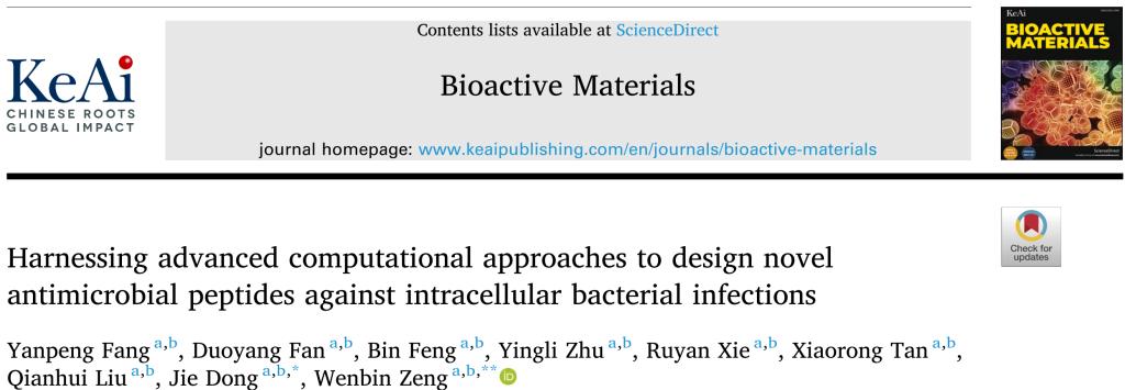 近日,伟德中国官网入口曾文彬教授-董界副教授团队在国际权威期刊《Bioactive Materials》(中科院一区Top期刊,IF = 18.0)上发表了题为“Harnessing advanced computational approaches to design novel antimicrobial peptides against intracellular bacterial infections”的原创性研究论文,为抗胞内菌感染药物开发开辟全新路径。伟德中国官网入口为该论文的第一通讯单位。伟德中国官网入口2024级博士生房岩鹏为第一作者,曾文彬教授和董界副教授为共同通讯作者。