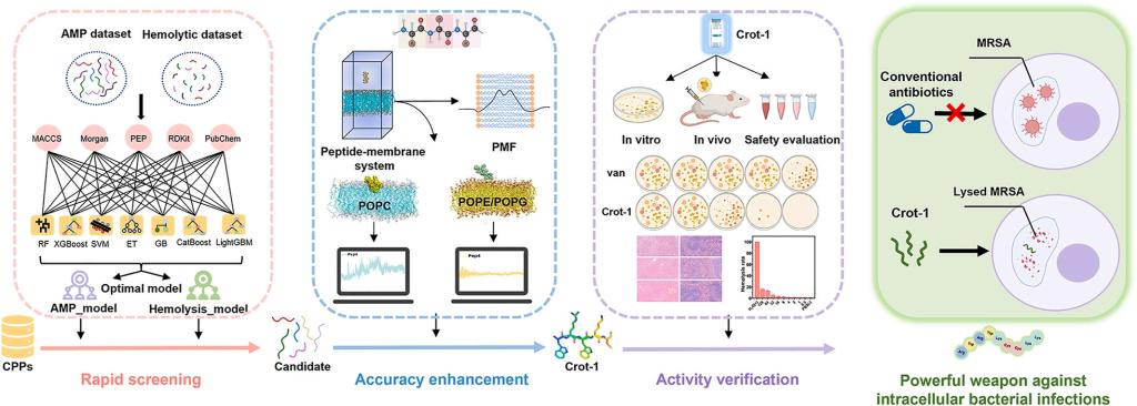 为了高效开发新型抗胞内菌感染药物,该团队开创性地将计算机辅助药物设计应用于抗胞内菌药物开发,提出整合人工智能预测、分子动力学模拟与实验验证的三位一体开发策略。针对胞内菌感染复杂生理环境,采用多级人工智能预测系统平衡候选药物的活性和毒性。基于跨尺度分子动力学模拟构建肽-膜相互作用综合评价体系,从原子层面解析候选分子的靶向性与作用机制。随后,制定系统的实验方案对于目标分子的生物活性进行全面验证。该研究成功从CPPsite 2.0数据库中筛选出候选药物Crot-1。实验结果表明,Crot-1可以高效清除寄生于巨噬细胞内的金黄色葡萄球菌,同时对宿主细胞保持良好的生物相容性。该研究不仅为抗胞内菌感染药物开发提供了新的途径,更构建了一套可扩展的计算驱动框架。其核心价值在于:宏观性质预测(AI)与微观机制解析(分子模拟)互补,突破传统试错模式;可适配不同靶点与疾病场景,为新型抗菌药物开发提供新的范式。