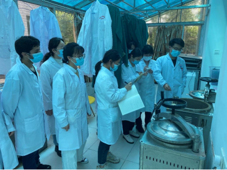 考试结束后,同学们换上白大褂,戴上防护手套和口罩,在实验室仪器安全负责人黄佳同学的指引下,来到了实验室各个房间接受现场仪器操作指导。“要注意,不能将塑料Tip盒置于烘箱最底层,否则会引发火灾!”“高压灭菌锅使用前要观察里面是否还有水,避免干烧”、“暗室荧光显微镜实验完毕后要及时关掉汞灯”……对于同学们的提问,黄佳同学细致耐心讲解,为同学们日后入室参与课题开展实验正确安全操作仪器奠定基础。