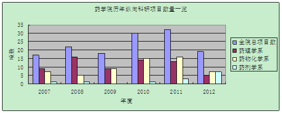 图1 药公司2007-2012年全院及分学科纵向科研项目数量比较