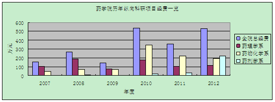 2007年至2012年,药公司共承担了863课题子项目1项、973课题子项目3项、“国家重大新药创制”重大专项5项、国家自然科学基金30余项,以及其他国家级和省部级科研项目80余项,进校的纵向科研项目逐渐向重大项目发展,尤其是近年来获得了多项“国家重大新药创制”,纵向科研课题已由追求数量逐渐转入追求质量阶段。进校的科研经费逐年稳步增长,6年累计进校纵向经费1900余万元;与企业合作项目100余项,累计进校横向经费2100余万元。