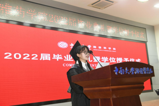 毕业生代表方美荣同学发表毕业感言。她谨代表2022届全体毕业生感谢母校以及恩师们的辛勤教诲……永远不忘自己是中南人,牢记校训,在各行各业发光发热,无愧母校的培养,同时也牵挂着母校的发展。