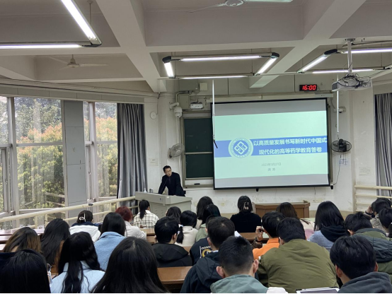 3月27日下午,公司党委书记龚涛在福庆楼T211教室为师生们主讲“开学第一课”,带领全院本科生、研究生干部及2022级硕士和博士深刻领悟“以高质量发展书写新时代中国式现代化的高等药学教育答卷”,勉励同学们从“开学第一课”中汲取奋进能量,在行动中践行党的二十大精神。