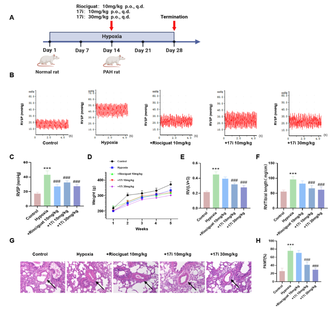 图2 化合物17 i有效地降低了缺氧诱导的PAH大鼠的RVSP并改善了血管重构