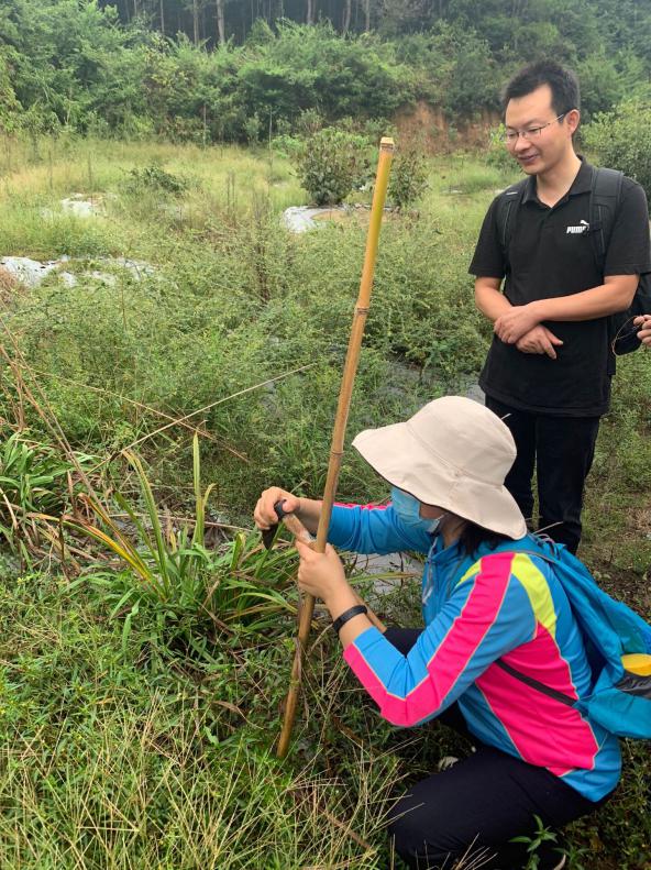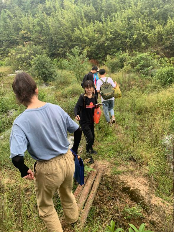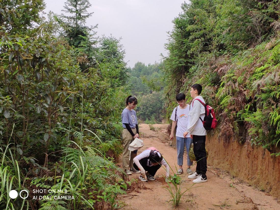 我们走过池水旁的小土堤、天水桥下的小石路、木头搭建的简陋小桥,一开始,每一位同学都热情满满,看到路边的奇特的植物会讨论一番。一段时间又恰巧遇到了小雨,为了不耽误进度,两位老师也陪着我们顶着小雨上山采集植物,道路越来越泥泞湿滑,我们艰难的往上爬,寻找着每棵具有特点的植物,然后老师很细心地给我们讲解,同学们各司其职,未曾抱怨喊累,有的负责采样品,有的负责贴标签,有的负责记录………我们时而闻气味,时而观察花序,时而比较果实和叶子;平常人看来是一棵棵野草,在老师眼里却是一个个宝贝,它的科、种和特征都被老师们描述的淋漓尽致。路途的劳累也没有消磨掉我们的热情,老师们神采奕奕地为我们介绍每一株植物时,令我更加佩服老师的专业性。