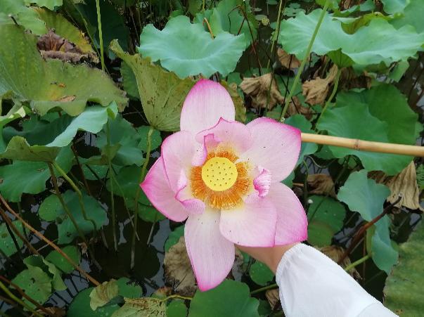 “出淤泥而不染,濯清涟而不妖”是描述莲花的诗句中最让我心生向往的一句,可惜莲池常见,莲花不常见,好好的荷花池常被藻类占据。药博园的荷花池,一眼望去是成片的荷叶,没看到那娇小粉白的身姿,我叹了口气。李老师依然走在前方,偶尔回过身向我们介绍莲藕。他学识渊博,脱口而出的故事令人入迷,突然,他示意我们看向某处——一朵洁白娇小的莲花静静盛开。好美的莲花,不见一丝污垢,单单看着它都觉得自己浮躁的内心受到洗涤。