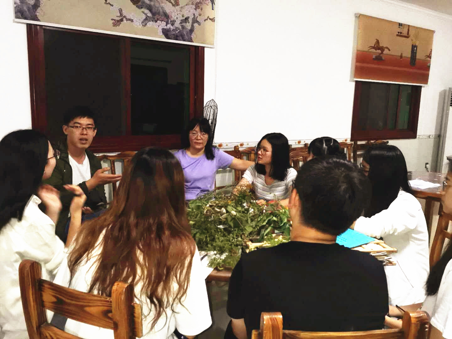 本次野外实习教学的两大改革之一:让每个员工从植物形态到药用部位再到功效地讲解一到两株植物,这种学习方式既调动了员工学习的积极性也锻炼了员工的查阅资料与现场讲解的能力,值得推广。图为员工在讲解(手持扩音器,很有仪式感)。