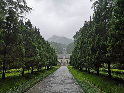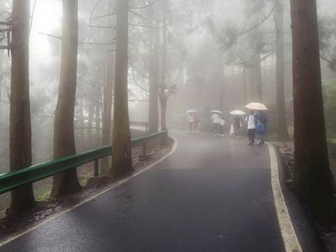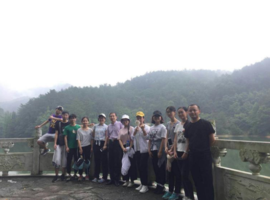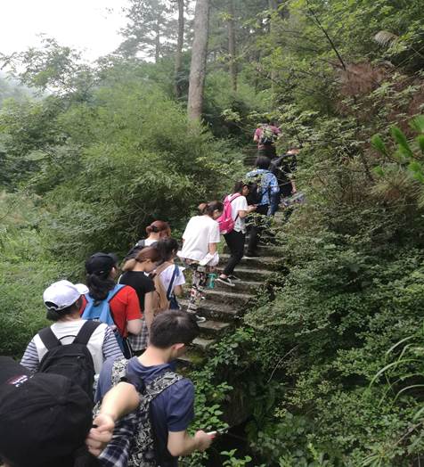 大巴只能到达山下景区停车场,基地安排了一辆面包车拖行李,从停车场到入门处再到基地,全靠徒步。雨中的衡山,被白雾拢罩,缥缈而迷茫,为赶在午饭前安顿好住宿,腾出下午的时间开始学习,员工们被要求以组为单位在带队老师的带领下埋头赶路。