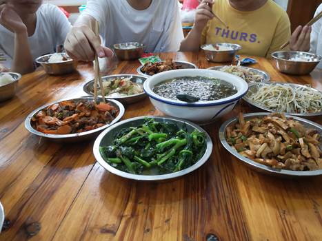 基地伙食:七菜一汤。味道有点淡、份量不太足,所以不下饭,对于外出爬了一天山的孩子们来说,是有可能吃不饱,看来下次考察除了卫生条件外的另一考察重点:伙食的味道和份量。