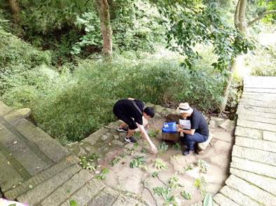 就地施教:在忠烈祠草地里发现目标。刘韶教授在讲解。