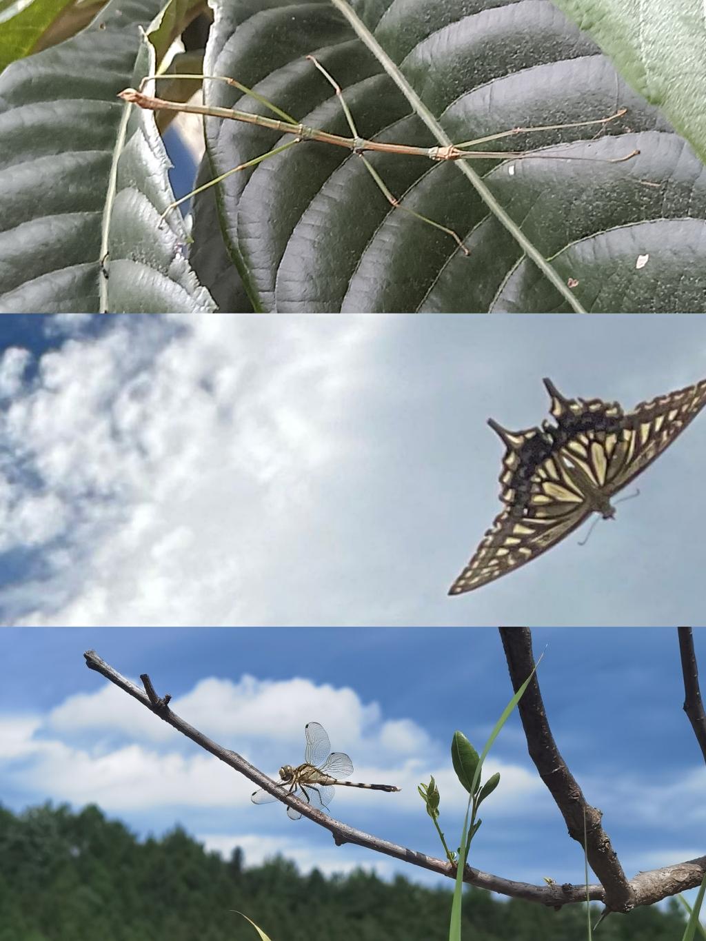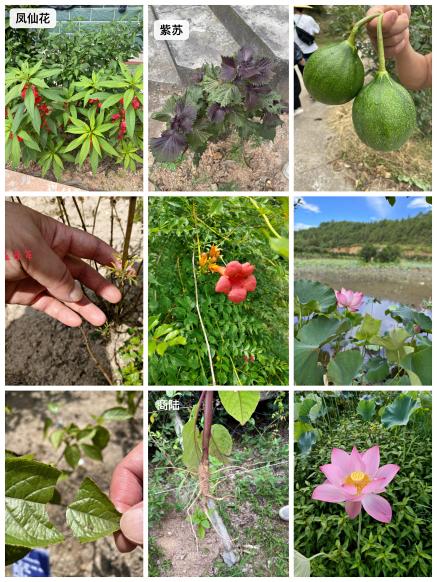 进山探险有险趣,途径山路时心里总会有隐隐的不安,害怕毒蛇的突然出现,可三天以来,与蛇素未谋面,倒是和很多其他小动物相会:追着我们讨要食物的鸭子,擅长伪装遁形的竹节虫和枯叶蝶,色彩斑斓的蝴蝶......走走停停间,我们也回顾了童年打水漂的快乐,为了一口西瓜走进村子,领略到了更多常见的农家植物:芋头,凤仙花,桃树等等,观赏了药博园门口盛放的荷花,带回了两个瓜蒌准备品尝。落日斜斜地从西边坠下,已将半边脸没入了远处山峦的绿色屏障,隐没在昏暝的光影中。视线掠过天空稀疏的云絮,落入松风阵阵的枝头。一阵阵余晖的光斑,在地上砸碎,散成一片金屑,装点了采药人的衣裳。挥去额上涔涔的汗水,在一片欢声笑语中返回基地。这样的美好画面,让我不禁想起了陆游那句“幽谷云萝朝采药,静院轩窗夕对棋”。